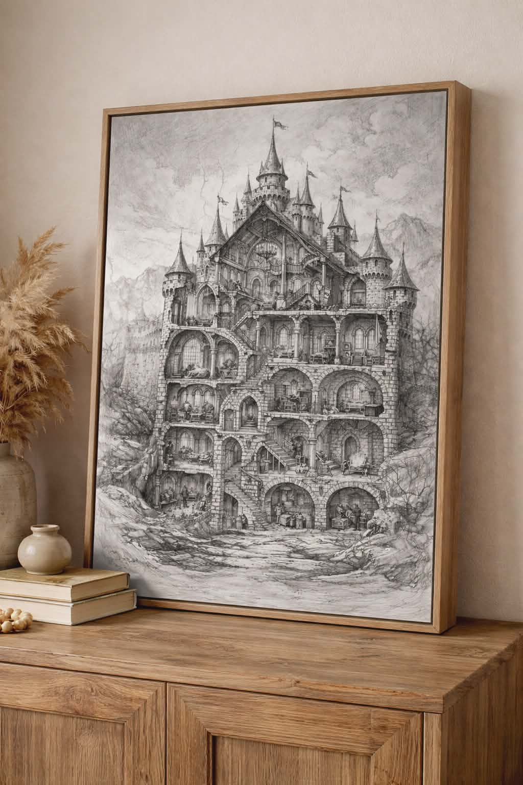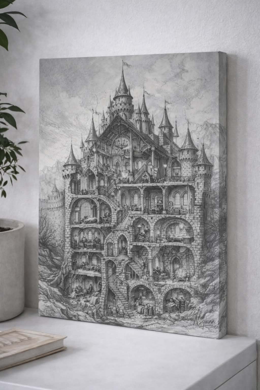 This hand drawn pencil artwork reveals a towering fantasy castle with all the little details exposed. The walls peel back to show the world inside. Staircases. Hidden rooms. Arched hallways. Tiny lives playing out quietly inside the stone.